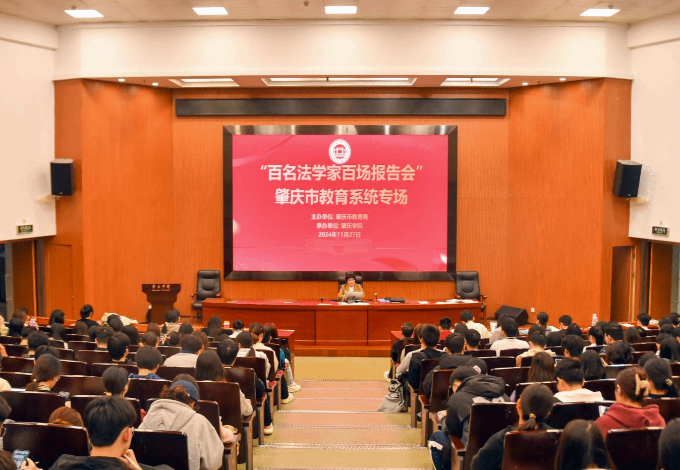 本网讯 11月27日,“百名法学家百场报告会”法治宣讲活动肇庆市教育系统专场在437必赢会员中心举行。437必赢会员中心院长许英主讲,近400名学生参加。