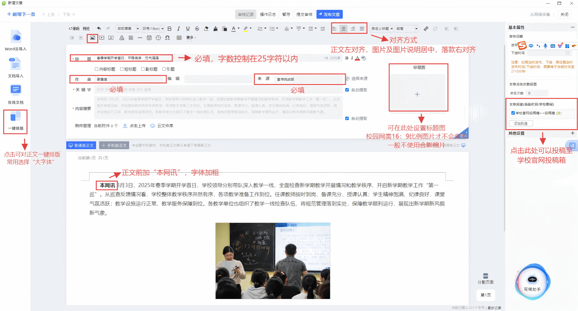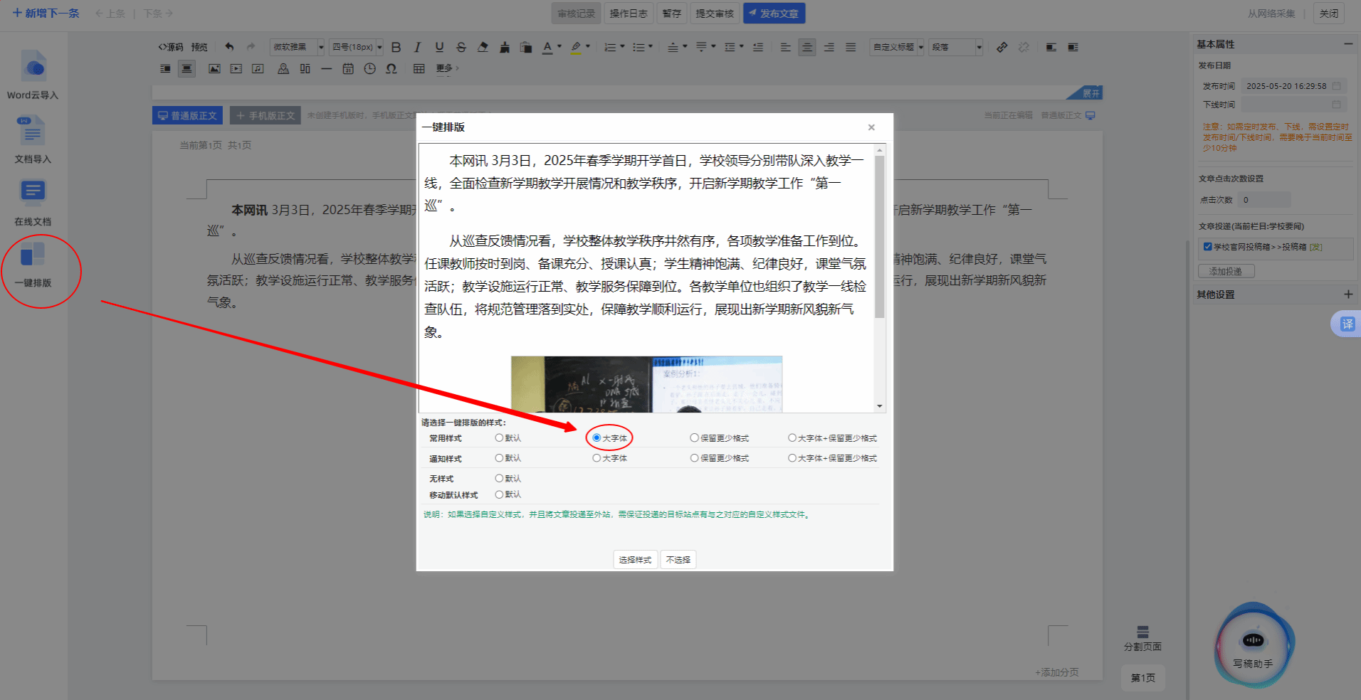 1.一键排版:点击编辑栏右侧的一键排版图片,选择“常规”“大字体”格式,可一建清除掉无用的word格式垃圾代码,使之符合网页规范和浏览的需要。一键排版后文章开头“本网讯”需手动加粗,图片说明和落款需手动居中和右对齐(页面如图5示)。