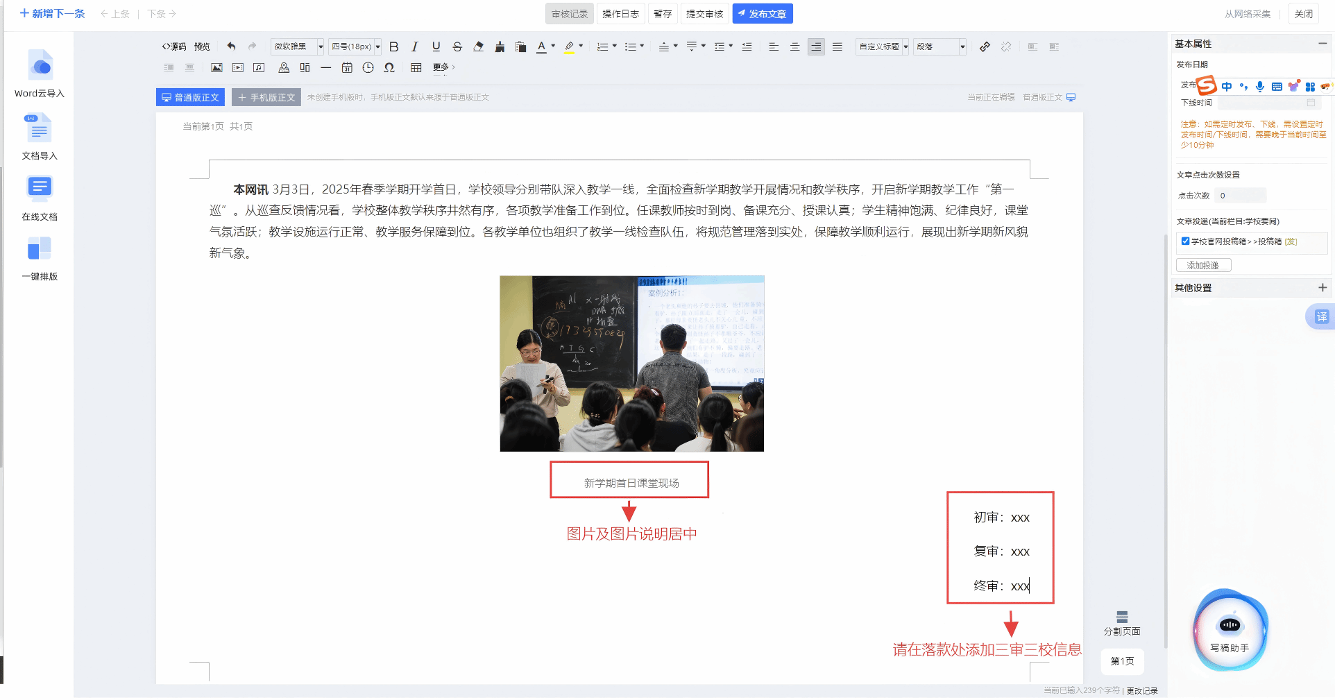 2.发布前请在编辑稿界面中依次录入稿件相关信息,并在正文下方写好三审三校信息(如图3、图4示)。