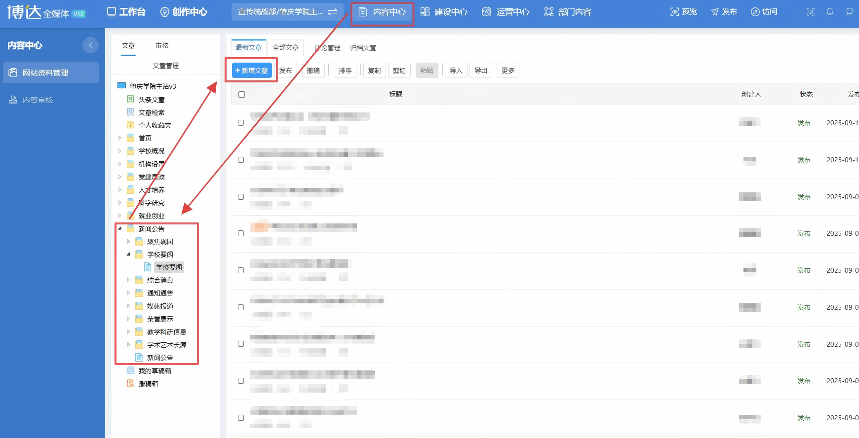 1.依次点击“内容中心”→ 文章管理下方对应发布栏目(各单位日常发布新闻稿件的栏目)→“新增文章”→“发布文章”(页面见图2),即可编辑、发布稿件或投稿。