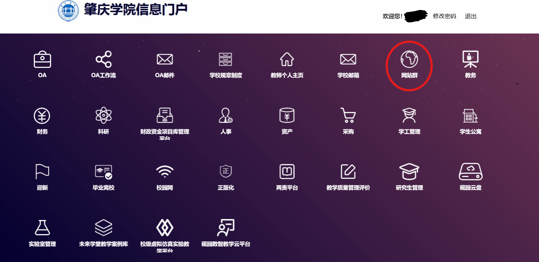 2.宣传员在OA申请VSB网站管理员后,通过“办事大厅”→“网站群”(页面如图1所示)登录后,进行投稿,录入、管理、发布本单位稿件并向校园网投稿。